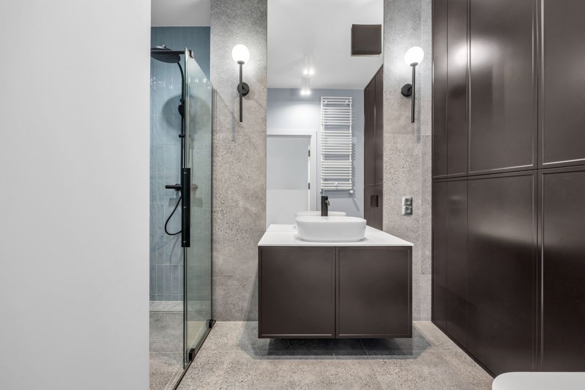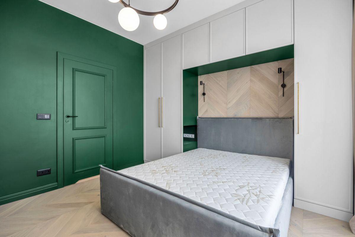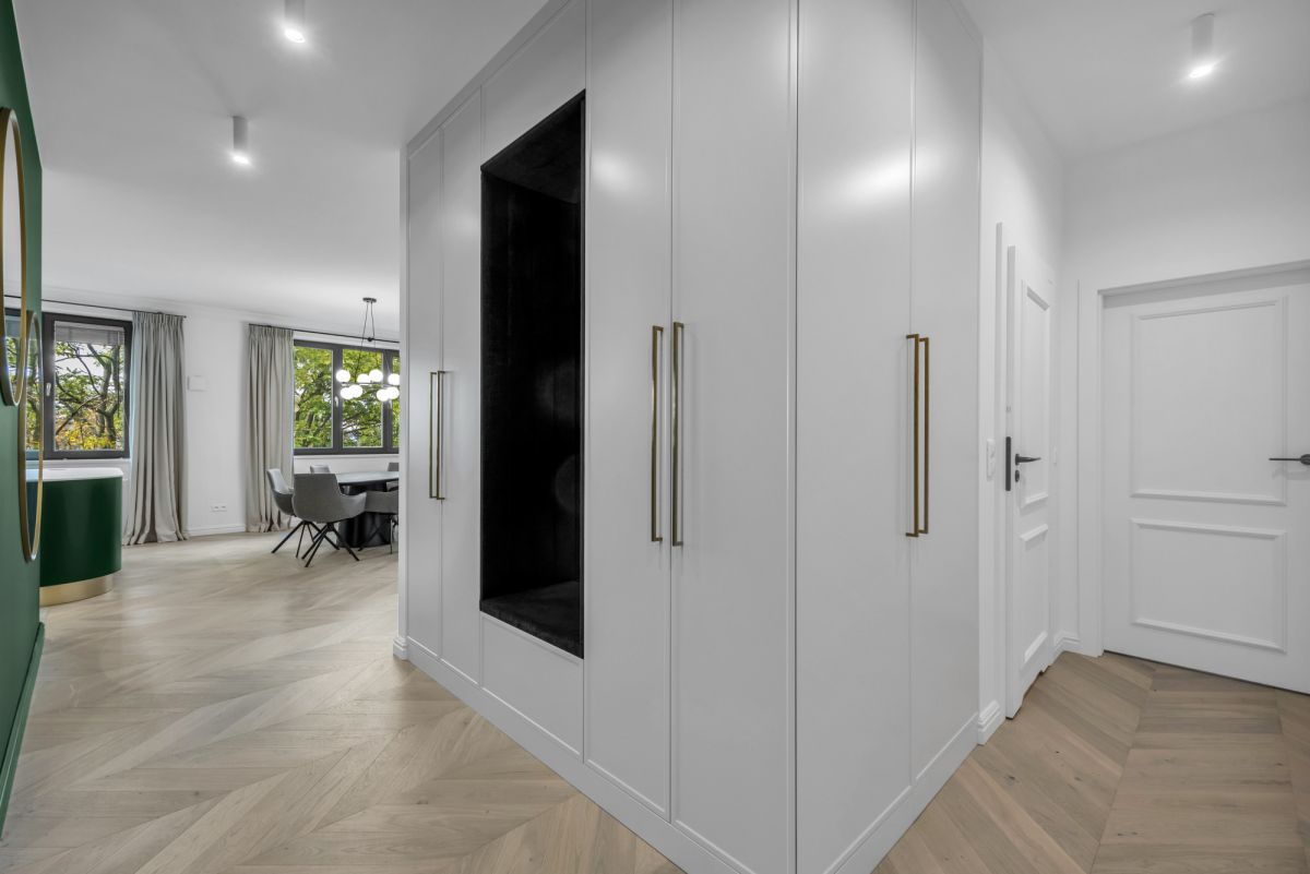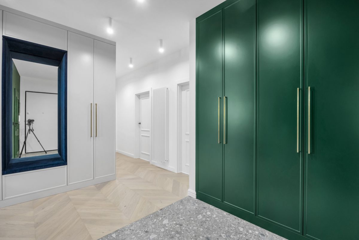 W mieszkaniu znajduje się bardzo dużo miejsca do przechowywania rzeczy, a cała zabudowa szafowa wykonana została na specjalne zamówienie.