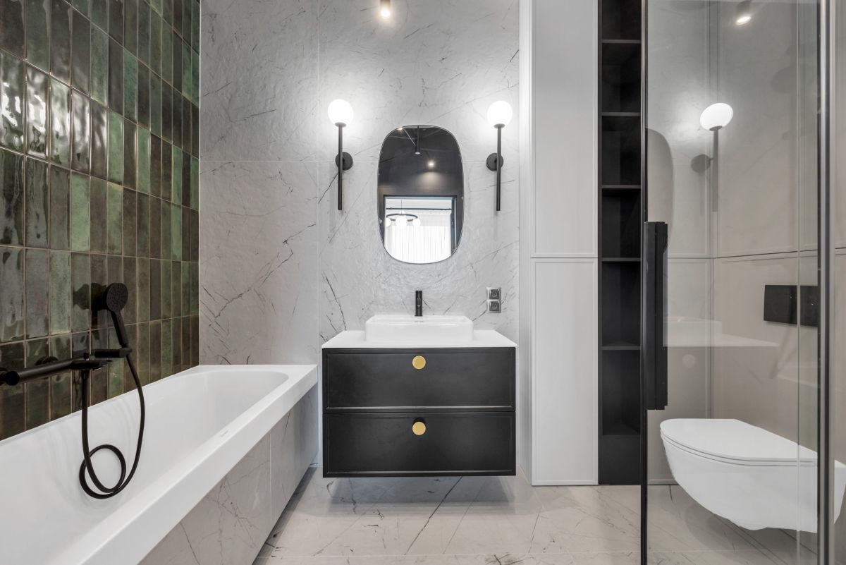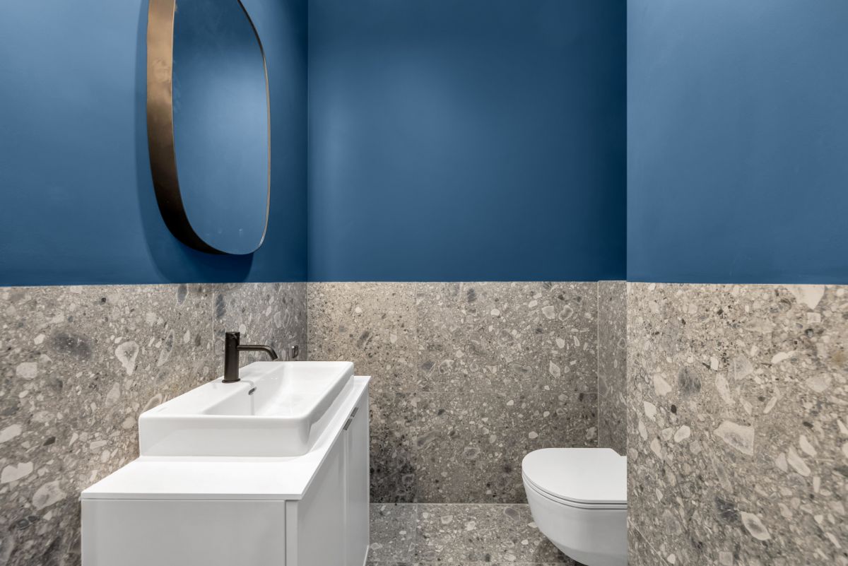 Apartament wykończony został bardzo dobrej jakości materiałami. Podłoga wykonana została z dużej litej deski dębowej, lastryko oraz płyt gresowych.