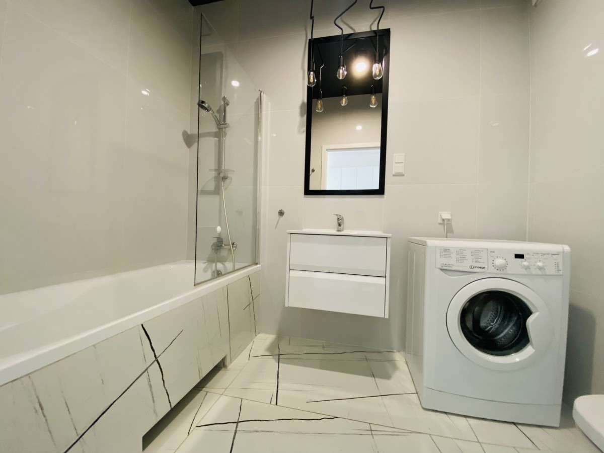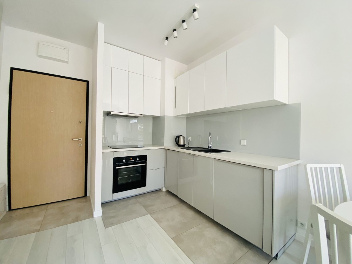 Kuchnia wyposażona jest w sprzęt AGD (pralkę, zmywarkę, piekarnik, lodówkę, płytę indukcyjną oraz okap) i posiada dużo miejsca do przechowywania rzeczy